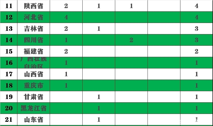 广西壮族自治区、山西省、重庆市等3个省市各获得一枚金牌,并列全国第16位。